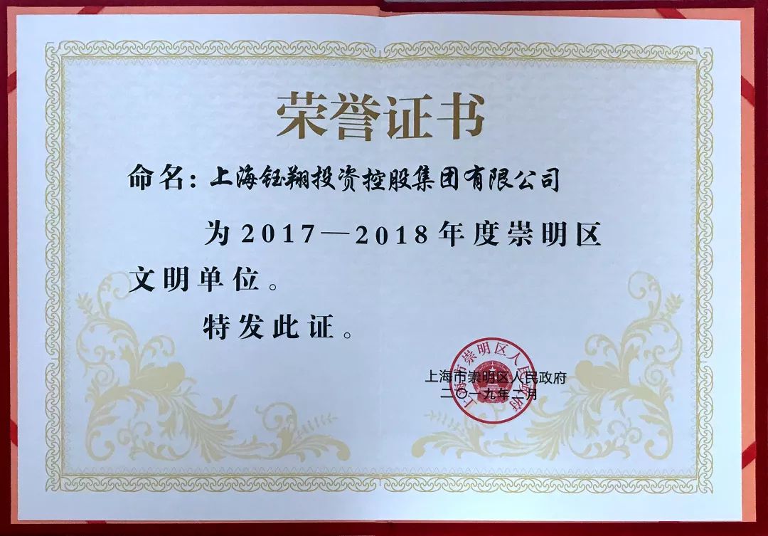 近日,钰翔控股集团再次被评为上海市崇明区文明单位,截至目前,钰翔控股集团已经连续荣获第十七届(2013—2014年度)、第十八届(2015—2016年度)上海市文明单位荣誉称号,目前正在积极参评第十九届(2017—2018年度)上海市文明单位。